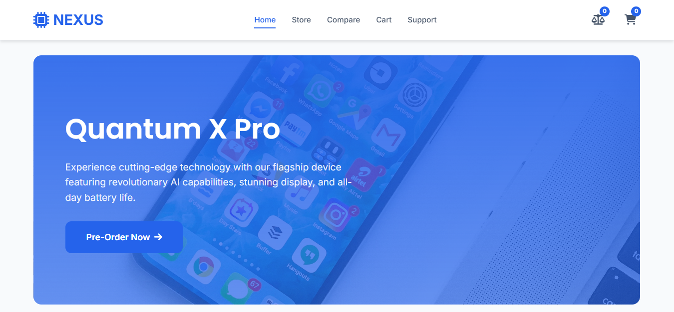 Futuristic electronics shop with comparison features and tech specs tabs.
