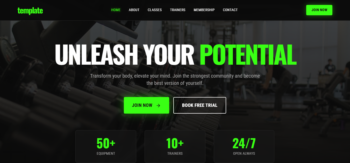 High-energy fitness site with membership plans, trainers, and BMI calculator.