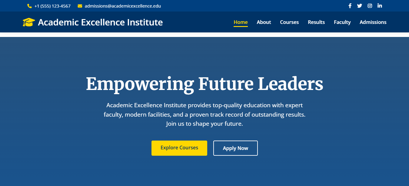 Education portal with results gallery, admission form, and news ticker.